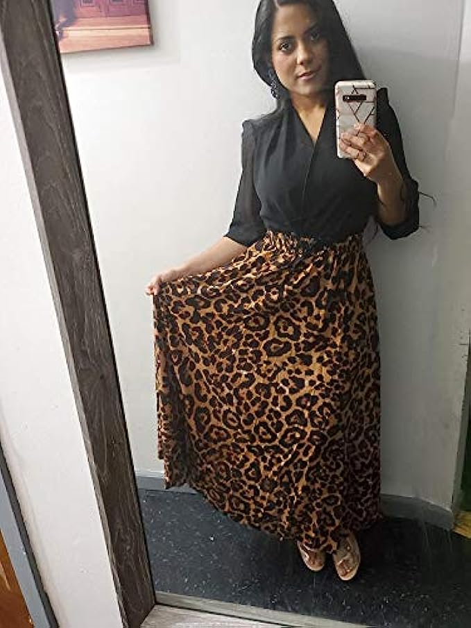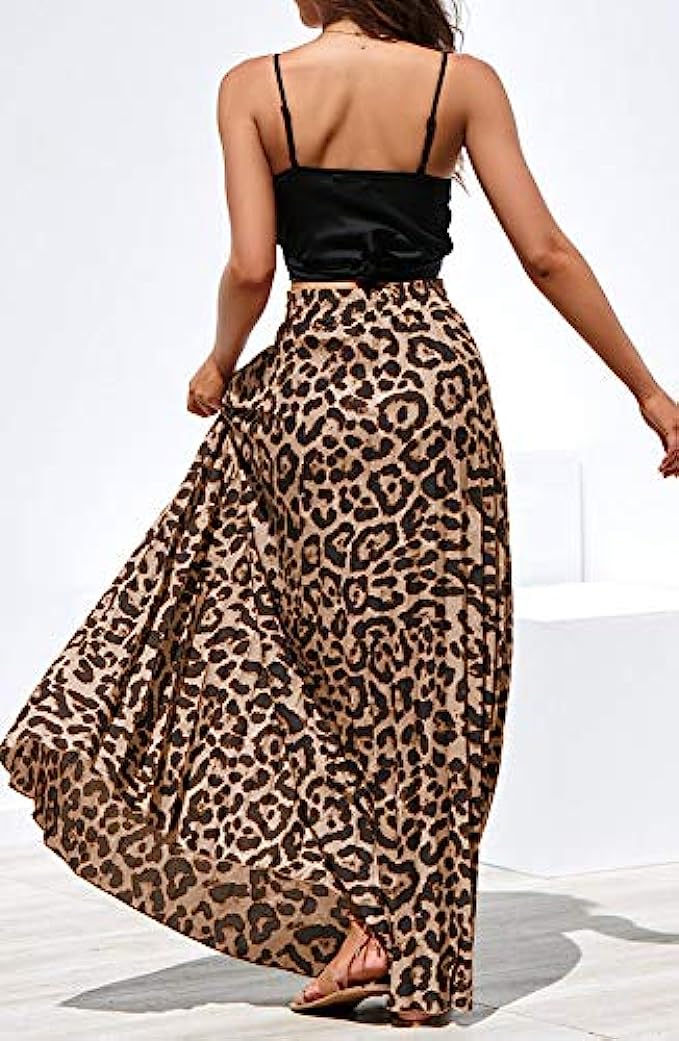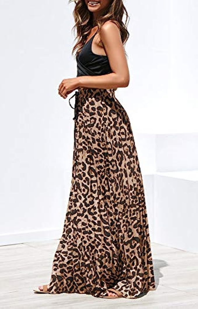 • Features: High rise, elastic waist, with drawstring, pleated, flowy and flared, a line, floor length long skirt, leopard print maxi skirt.